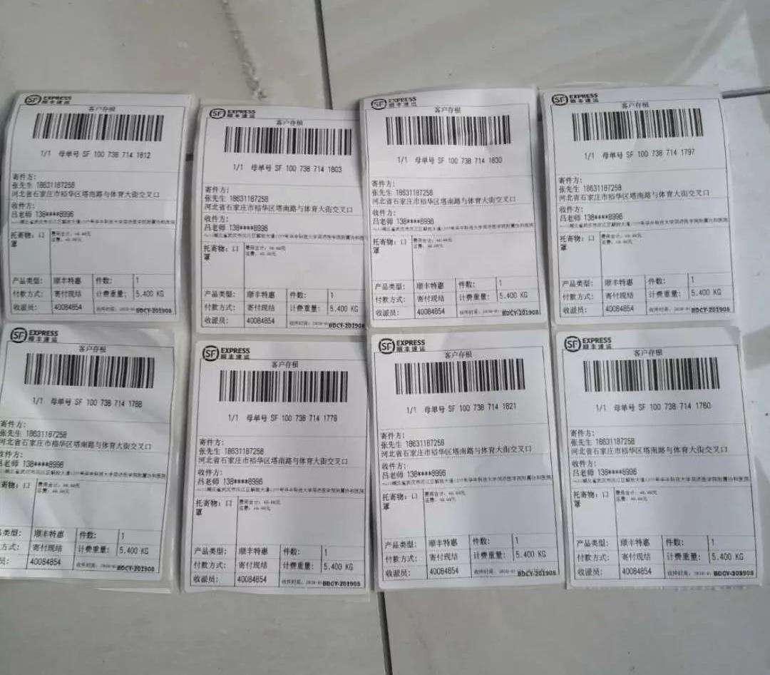 郵寄武漢協(xié)和醫(yī)院的快遞單(說明:因順豐快遞郵寄當(dāng)時寫手套下不了單,寫口罩才能下單,經(jīng)快遞員與公司溝通,同意寫口罩。)