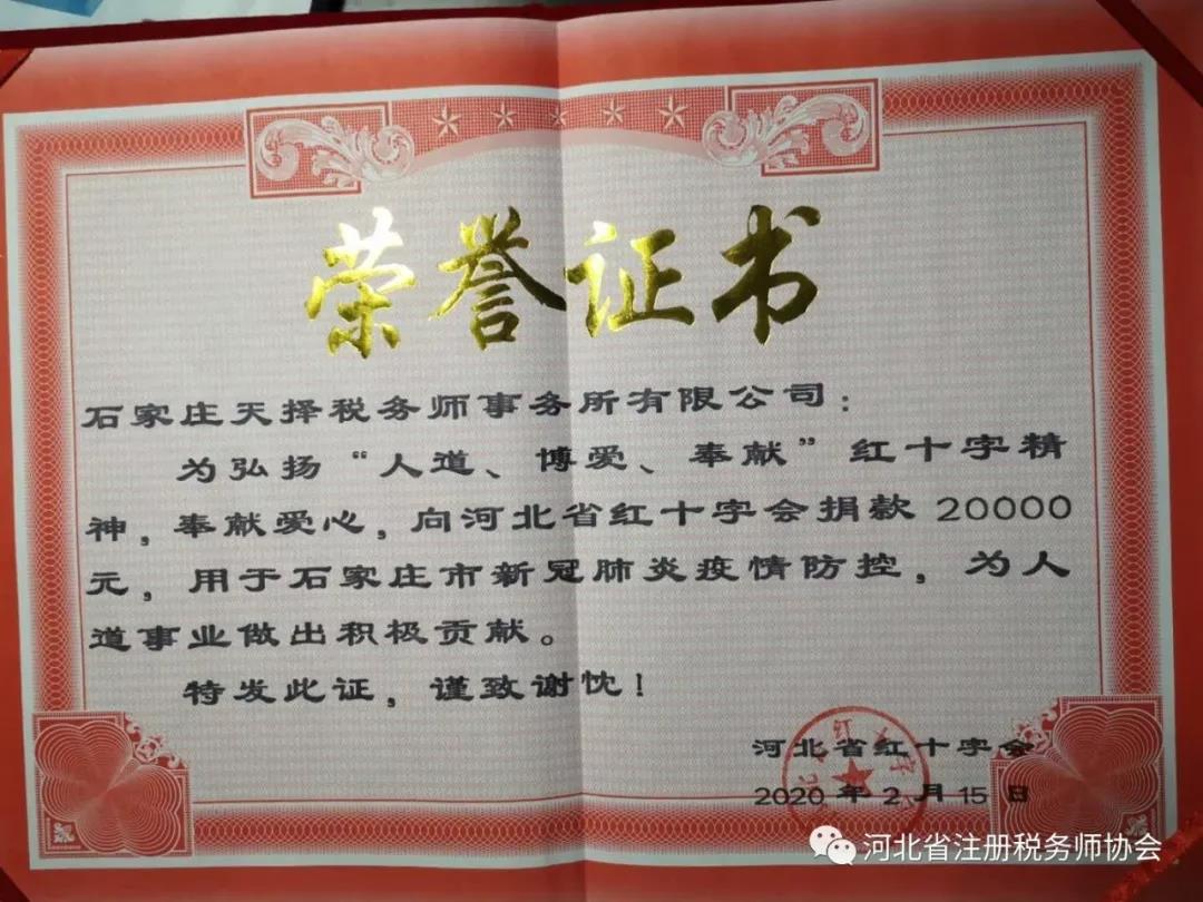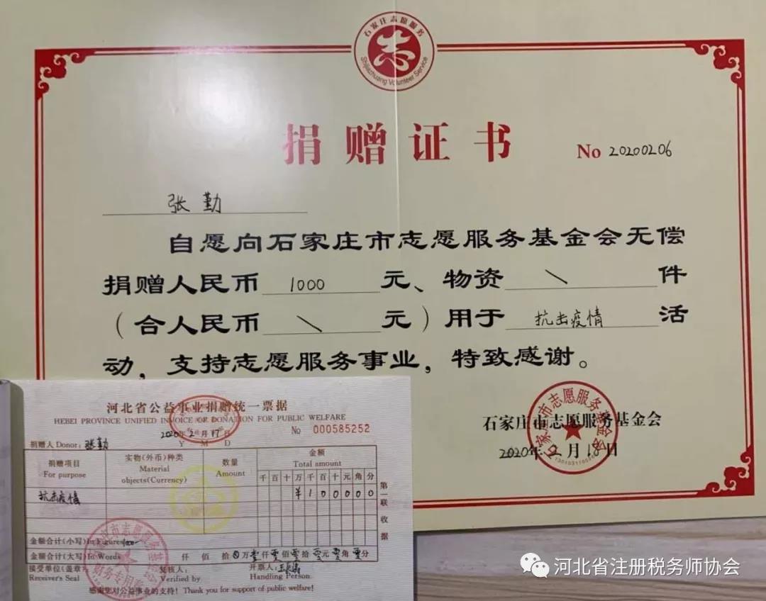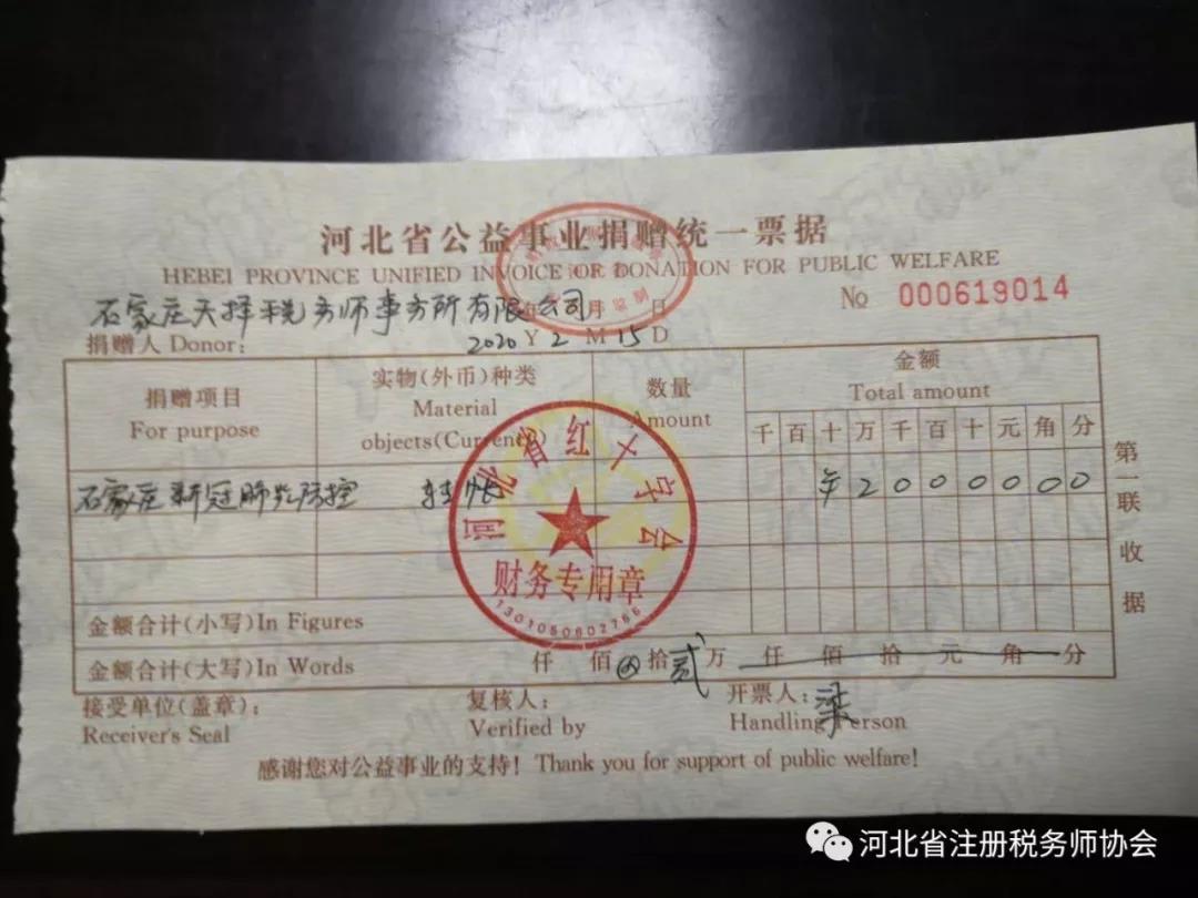 2、所長張勤在2月中旬看到疫情還在蔓延,看到那些遭受病毒折磨的同胞,那些堅守在一線的‘戰(zhàn)士’。深感作為稅務(wù)師,就應(yīng)全力奉獻自己的力量,跟全國人民一起打贏這場戰(zhàn)役。隨后石家莊天擇稅務(wù)師事務(wù)所再捐款兩萬元用于新型冠狀病毒肺炎的疫情防控。