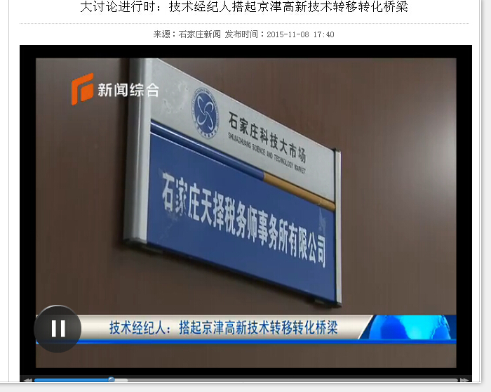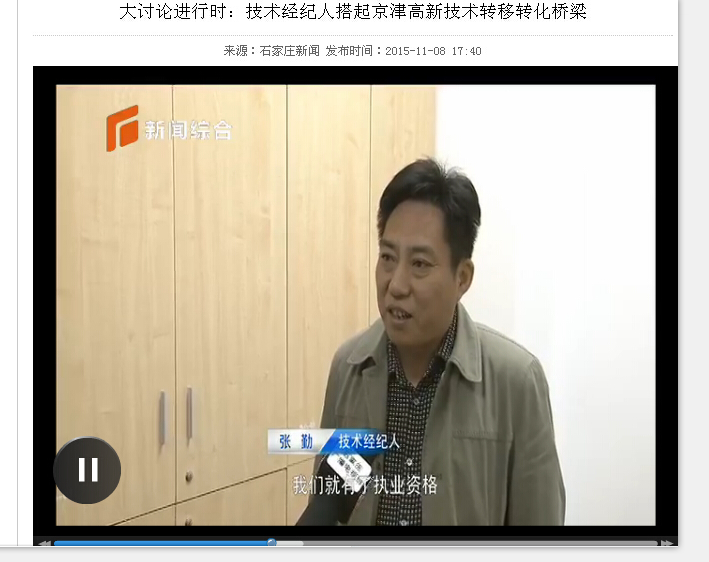 2015年11月7日,張勤董事長接受了石家莊電視臺采訪。今后,可以利用北京、天津、河北三地的科技資源,為供需雙方進行技術對接,使大量有錢沒有項目的企業(yè),有成果沒有資金的科研院所,通過技術對接尋找到適合自己需要的合作方,實現(xiàn)技術資源的優(yōu)化配置。